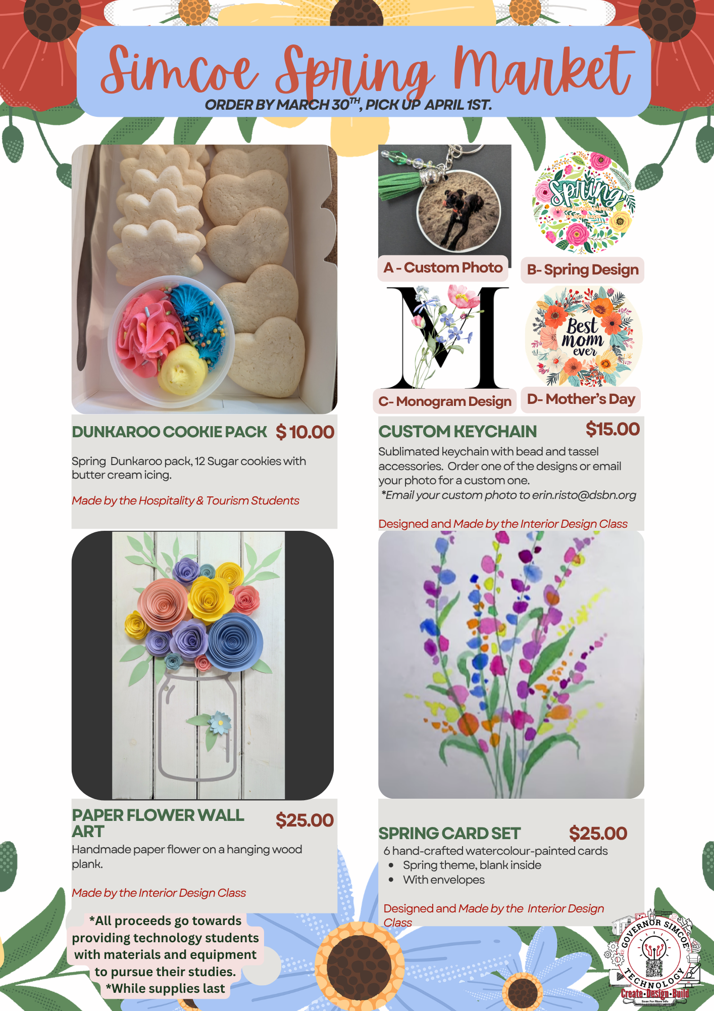 Orders close on March 30th, and pick up in room 123 on April 1st. All proceeds go towards providing technology students with materials and equipment to pursue their studies.